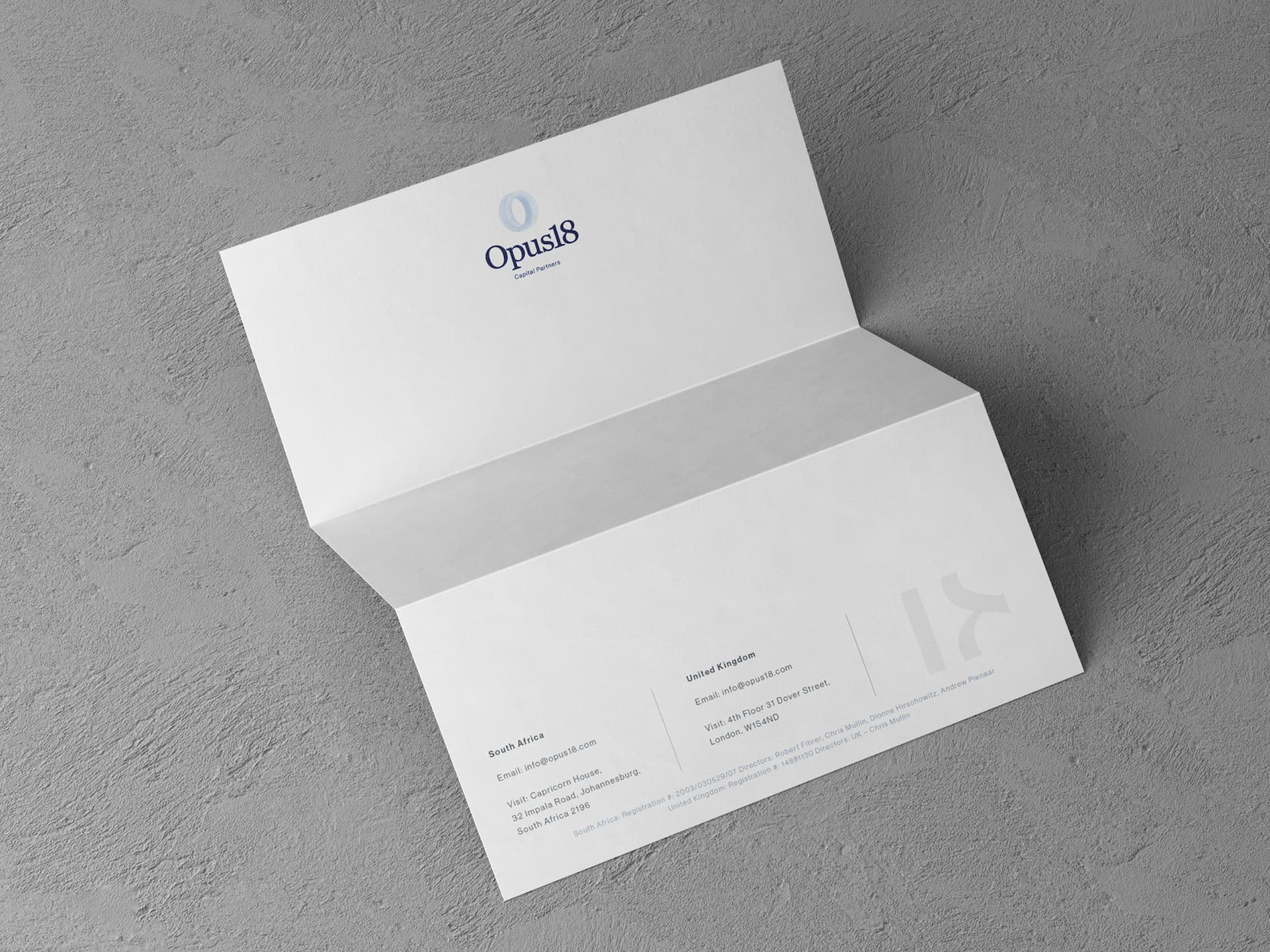Rebranding a deeply established and venerated business calls for genuine respect for its origins, a nuanced understanding of stakeholder perceptions and lived brand experiences, and a clear appreciation of its evolved capabilities and long-term ambitions. Branduo assumed this responsibility, partnering with the Capricorn team to bring their new business name - Opus18 Capital Partners - to life, and to imbue the brand’s refreshed verbal and visual identity with the considered meaning this distinctive name carries.
